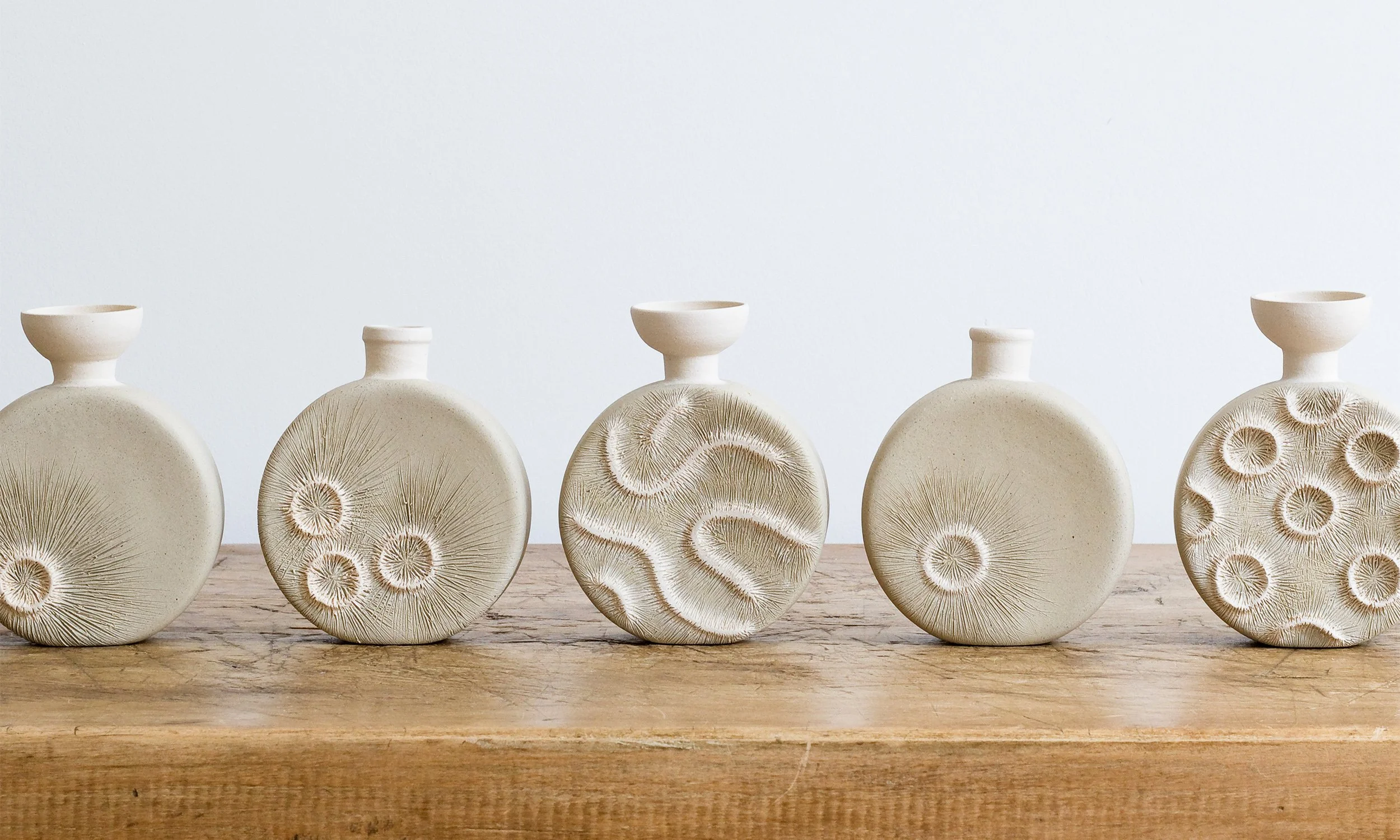 A childhood growing up alongside the New Forest's Coastal Path heavily influences her work as she takes inspiration from microscopic forms occurring within nature; in particular sea coral and Radiolaria. Using a variety of tools, she replicates these textures onto the surface of her clay forms.